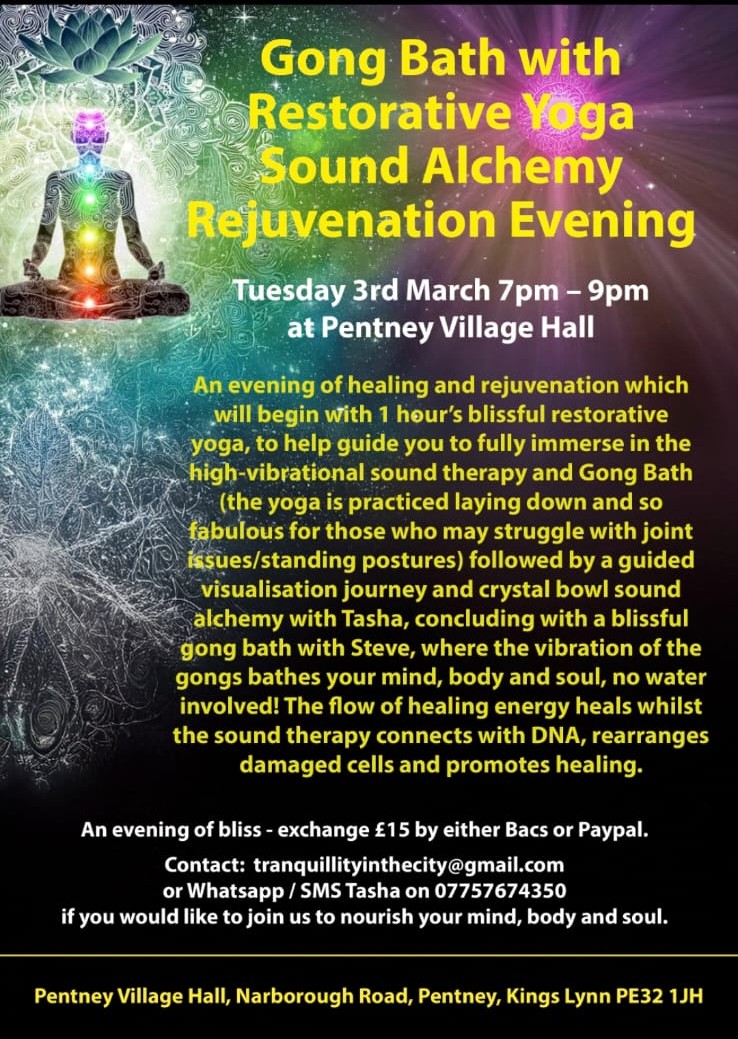 I warmly invite you to join Tasha Walker & Stephen Allen on Tuesday 10th February at 7pm - 9pm, for an evening of healing and rejuvenation which will begin with 1 hour's blissful yin / restorative yoga, to help guide you to fully immerse in the high-vibrational sound therapy and Gong Bath in a peaceful environment, to include restorative yin yoga (all practiced laying down and so fabulous for those who may struggle with joint issues / standing postures) followed by a guided visualisation journey & crystal bowl sound alchemy with Tasha, concluding with a blissful gong bath with Stephen Allen. We will bathe in the sound of the gongs & crystal bowls to heal both mind, body and spirit. No water is involved